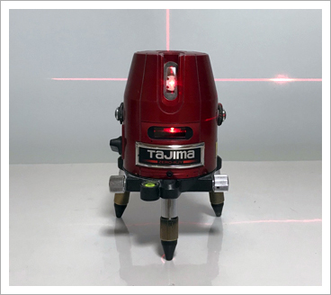 ■数本のレーザー光が壁・天井・床に照射され水平、垂直などの基準となる線を出す精密機械。 建築現場においては、色々な物を取り付けるために多くの業者が使用しています。
